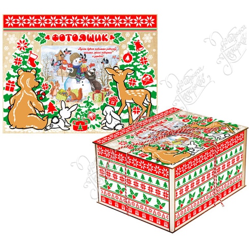 Фанера. На крышке предусмотрено место для фото Вашего ребенка. Подарок упакован в красочный пакет с новогодней символикой.