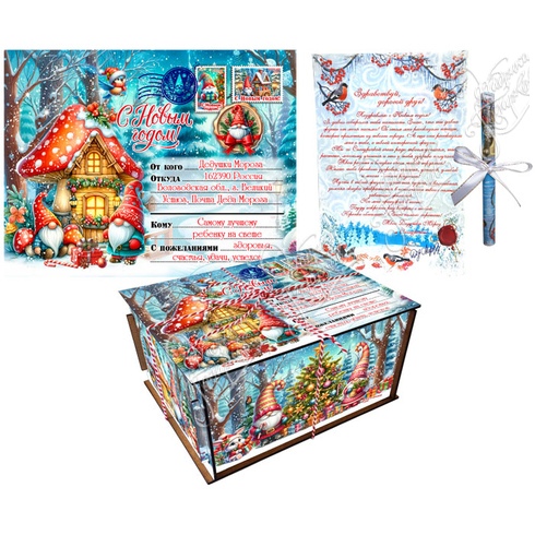 Фанера. Подарок упакован в красочный пакет с новогодней символикой. Внутри письмо поздравление от Деда Мороза.