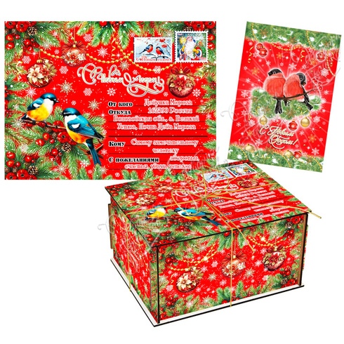 Фанера. Подарок упакован в красочный пакет с новогодней символикой. Внутри письмо поздравление от Деда Мороза.