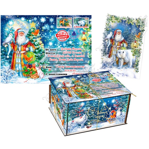 Фанера. Подарок упакован в красочный пакет с новогодней символикой. Внутри письмо поздравление от Деда Мороза.